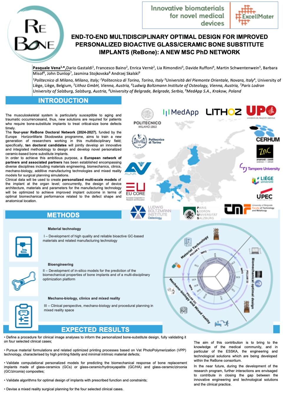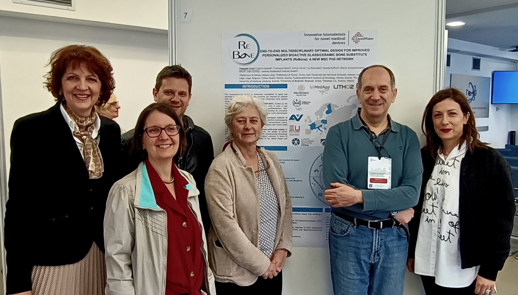A delegation of the ReBone project was at the ExcellMater Conference 2024: Innovative Biomaterials for Novel Medical Devices (April 9th – April 12 2024, Belgrade, Serbia). A poster with a general description of the ReBone project was presented. From left to right: Bojana Obradovich – ExcellMater conference chair – (UOB), Silvia Spriano (POLITO), Andrea Cochis (UPO), Lia Rimondini (UPO), Pasquale Vena (POLIMI), Jasmina Stojkovska (UOB).