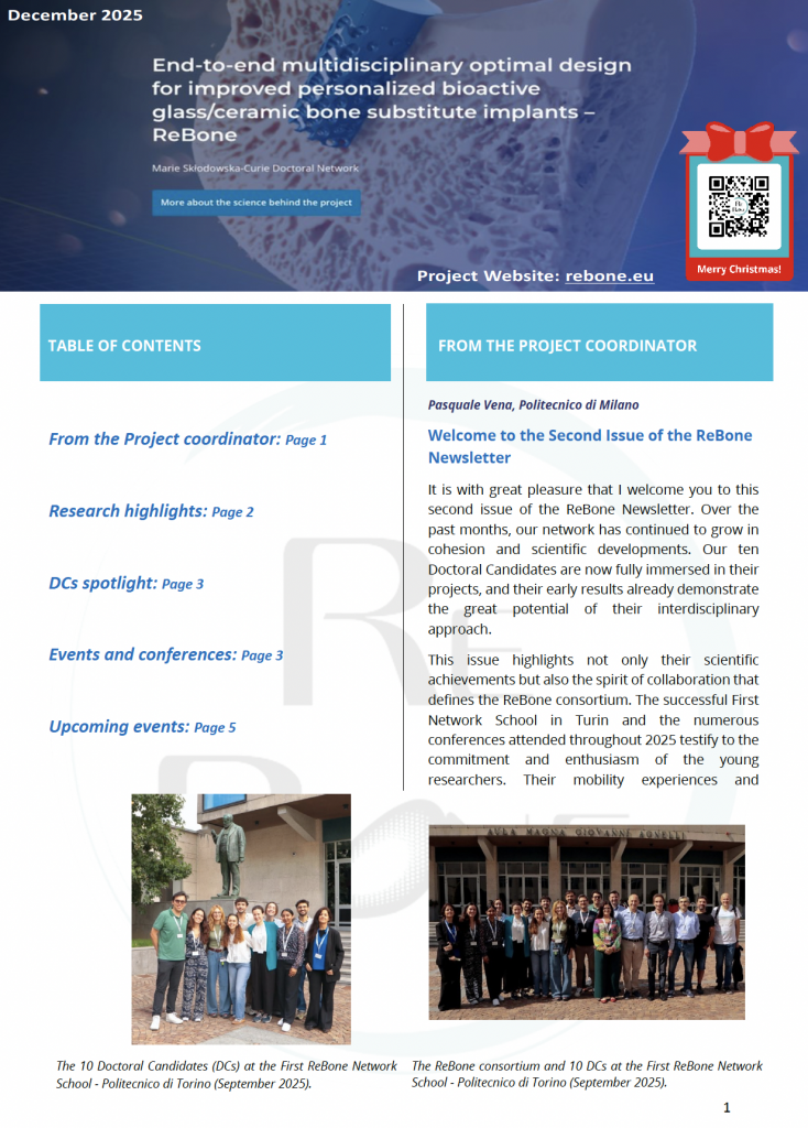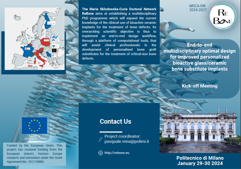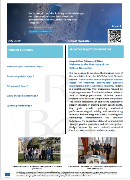 ReBone, a dynamic four-year doctoral network supported by Marie Skłodowska-Curie Actions, is dedicated to revolutionizing the training of researchers on creating 3D-printed personalized bone replacement implants using bioactive ceramics, optimizing mechanical performance, surgical implantability, and manufacturing reliability.