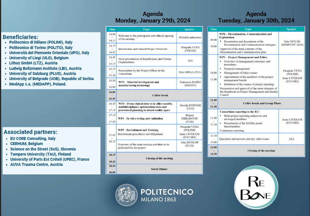Politecnico di Milano, January 29 2024: The ReBone group at the kickoff meeting. From left: Pasquale Vena (Politecnico di Milano), Barbara Misof (Ludwig Boltzmann Institute, Austria), Bojana Obradovic (University of Belgrade), Francesco Baino (Politecnico di Torino), Enrica Vernè (Politecnico di Torino), Ivan Ginga (Project Officer), Lia Rimondini (Università del Piemonte Orientale), Saśa Novak (Science on the Street, Slovenia), Dario Gastaldi (Politecnico di Milano), Irene Liverani (Eucore Consulting), John Dunlop (University of Salzburg), Katia Pinna (Eucore Consulting), Andrzej Skalski (MedApp, Poland), Davide Ruffoni (University of Liegi, Belgium), Markus Hartmann (Ludwig Boltzmann Institute, Austria), Jasmina Stojkovska (University of Belgrade)