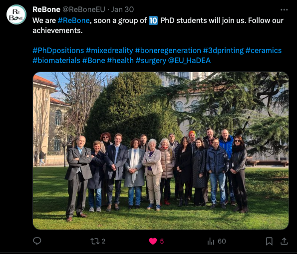 In this program, ten PhD candidates will be selected to collaborate in a multidisciplinary setting that includes advanced 3D printing technologies, biomechanics, mechano-biology, clinics, and mixed reality in addition to material science and technology. A stimulating training program that incorporates contributions from academics as well as clinical and commercial partners from Italy, Austria, Belgium, Republic of Serbia, France, Slovenia, and Finland, assembled in an exceptional partnership led by Politecnico di Milano, will be offered to the young researchers.